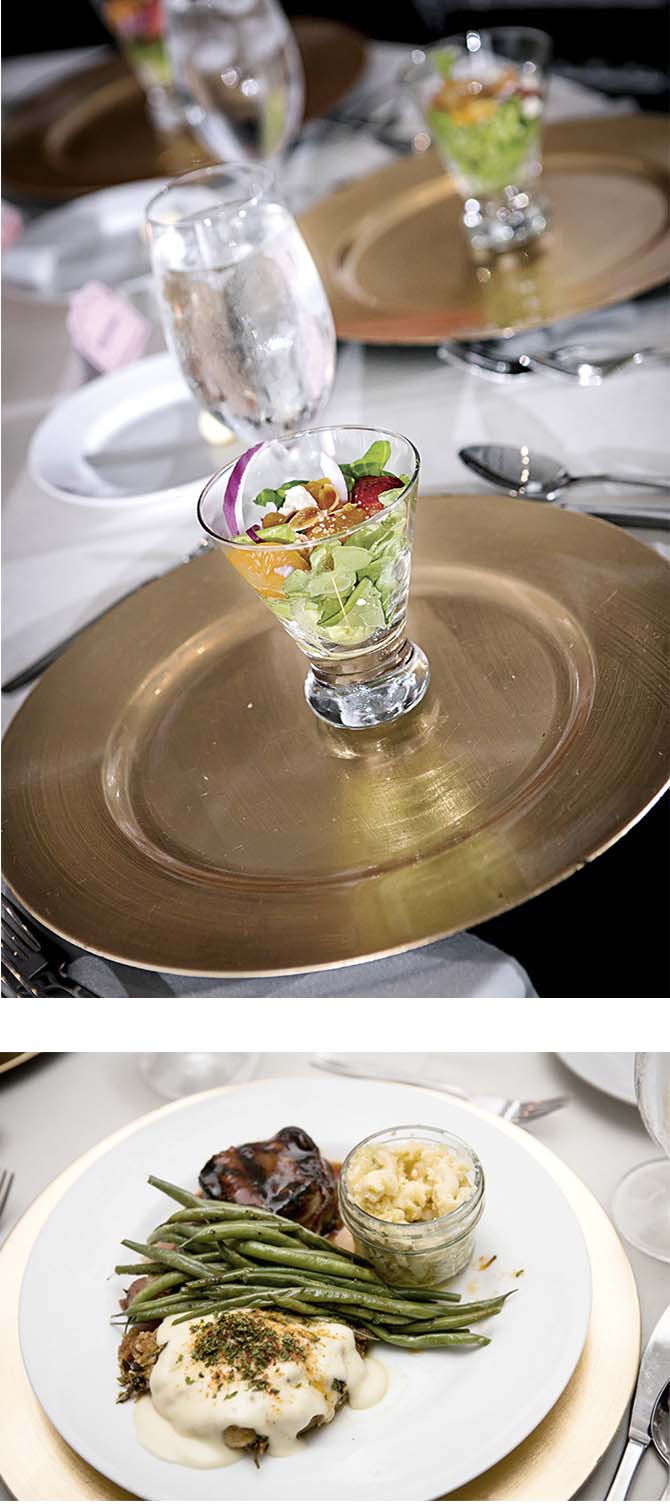 Food: Masterson’s Catering; sit-down meal with salad, two meat entrées, potatoes, macaroni and cheese, green beans, roll