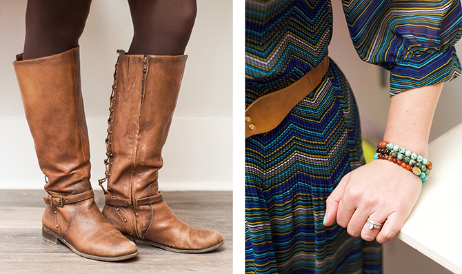 “Mostly, I wear what I purchase from the store. All the clothes are made in the U.S. and are ethically made, so I feel good about these purchases. I tend to wear a lot of bold-colored dresses with boots. I like to have a classic silhouette.”