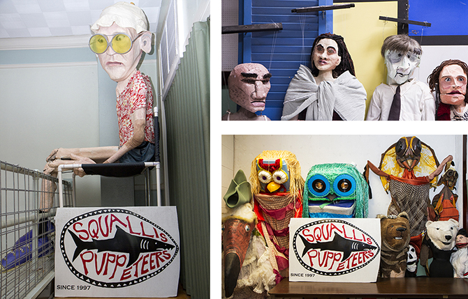 Nora and her husband make all of the puppets. Clockwise from left: This puppet was commissioned by the Forecastle festival in 2013 and represents local writer Hunter S. Thompson; Bunraku puppets;