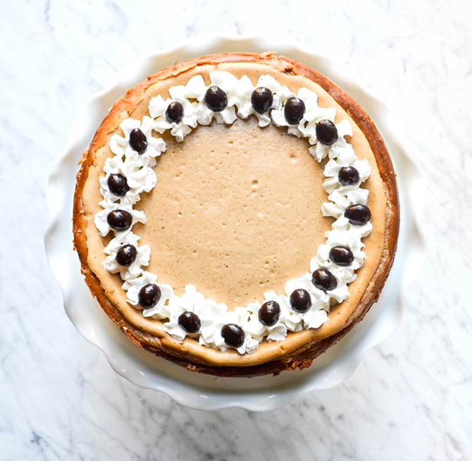Top with whipped cream and chocolate covered espresso beans, if desired. Cover leftover cheesecake and store in the refrigerator for up to 4 days.