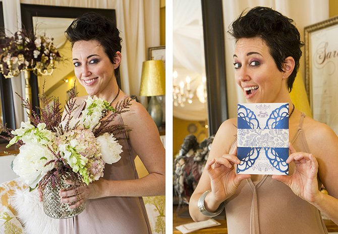(L-R) One of Amy’s floral arrangements and a fanciful invitation designed by Carrie Ann. |