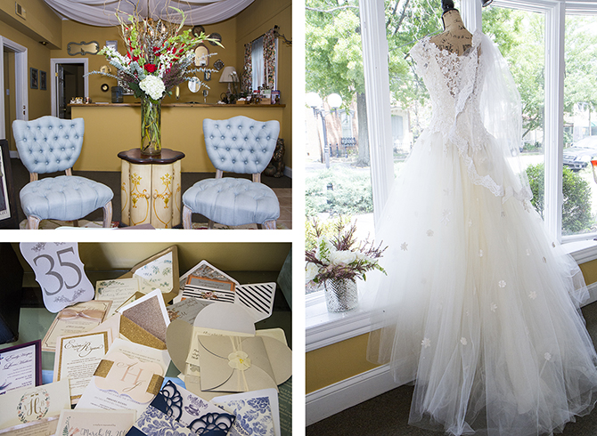 Clockwise: Merci Bouquet’s consultation room. A vintage wedding gown used as their window decor; An array of Carrie Ann’s invitations. |
