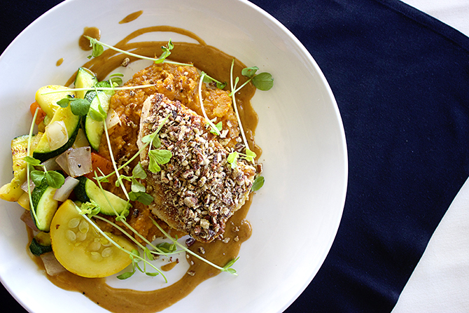 Chef John Varanese always has something up his sleeve, and is constantly turning out new seasonal offerings at his Frankfort Avenue eponymous restaurant, Varanese. This season, we’re craving one of his ‘house favorites,’ a pecan encrusted California white bass paired with assorted veggies and set atop molasses whipped sweet potatoes. The dish is finished with a bright honey jalapeno butter sauce and garnished with microgreens, adding a touch of freshness.