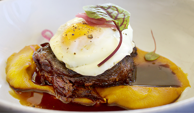 Spanish tapas are the star at Artesano, a Westport Village hot spot, with a handful of large plates also available for those looking to truly indulge. The chefs behind Artesano’s delicious creations know that on the coldest of nights, they have a winner with their braised short rib dish, which is set atop a puree of roasted butternut squash and garnished with pickled shallots and mustard salad greens. A perfectly fried, sunny-side-up egg crowns the presentation, the runny yolk acting as a binder and unifying this winter-rich meal.