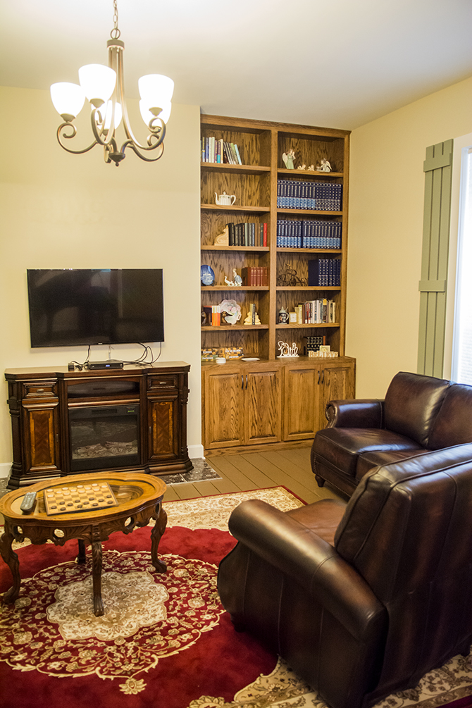 The bookshelves and cabinets in this library were made by her remodeler Willard Nolan. |