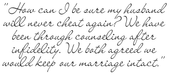 Q: “How can I be sure my husband will never cheat again? We have been through counseling after infidelity. We both agreed we would keep our marriage intact. We have four children who are depending on us to make this work. It was extremely difficult on them during our separation. Neither of us desire to put them through any more anguish. We want to see them graduate and get married. However, I’m feeling terribly insecure about whether this is the last time something like this would ever happen, especially since our relationship has not improved.”