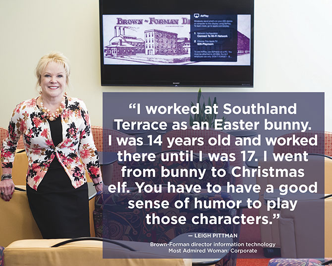 Leigh Pittman once played Easter bunny at a local shopping center. Now she is director of information technology at Brown-Forman. She has also worked in the world of finance and investments. She says she has learned to soften her Type A personality, although to talk to her you wouldn’t know it. She has had quite a career path, and she shares the lessons she has learned along the way. Photo by Melissa Donald.
