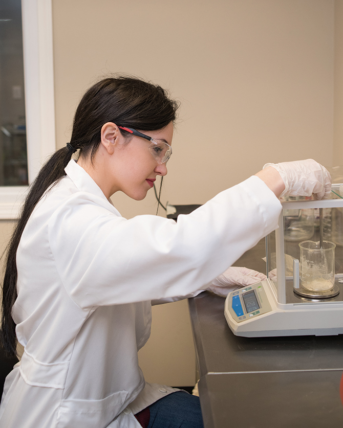 | Marie is in the winterization lab weighing out the materials necessary for molecular filtration of cannabinoid solutions. Photo by Sunni Wigginton |