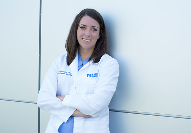 Jorja Magley, 26, has mastered the night shift as hospitalist physician assistant at Norton Brownsboro Hospital, working 7pm to 7am. Jorja (pronounced “Georgia”) is the go-to woman when a patient becomes ill during the night. “If a patient starts to become sick, their blood pressure spikes, or heart rate drops, then I am the one the nurse calls. I also care for patients who require additional medical care and need to be admitted to the hospital from the Emergency Department. I order additional tests and lab work and take care of these patients throughout the night,” she explains.