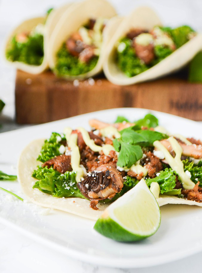 Layer chopped kale on the bottom of a warm tortilla. Top with a few tablespoons of chorizo and mushroom mixture and sprinkle on cheese, as desired. Drizzle on prepared avocado crema and garnish with cilantro.