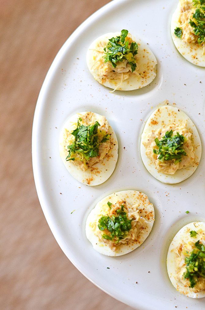 Spoon the mix into the egg halves, and top each with about a 1/2 tsp gremolata.
