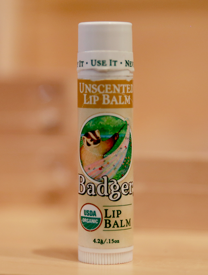 Badger Balm is an unscented organic lip balm that I use year-round. I find it works the best for me and I keep it with me all the time. The company carries other moisturizer and healing balms, but I stick with the lip balm.