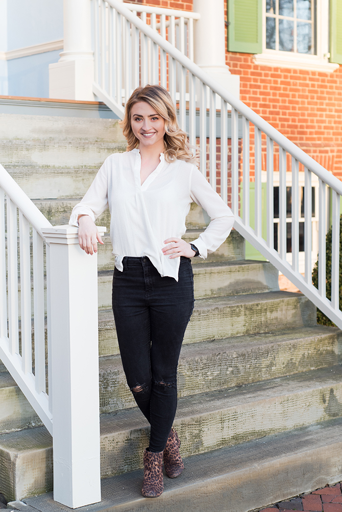 All black everything. Courtney’s favorite pants are high-waisted black jeans with ripped knees. “I would wear them with a black or white top every single day if I could,” she says. She loves to pair her favorite jeans with leopard booties or her ASOS booties with a mirror heel.