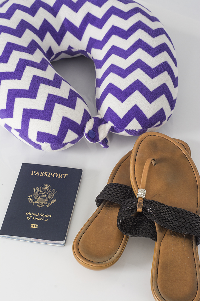Kendra takes her flight pillow when traveling. The sandals come in handy for warmer climates. Photos by Melissa Donald |